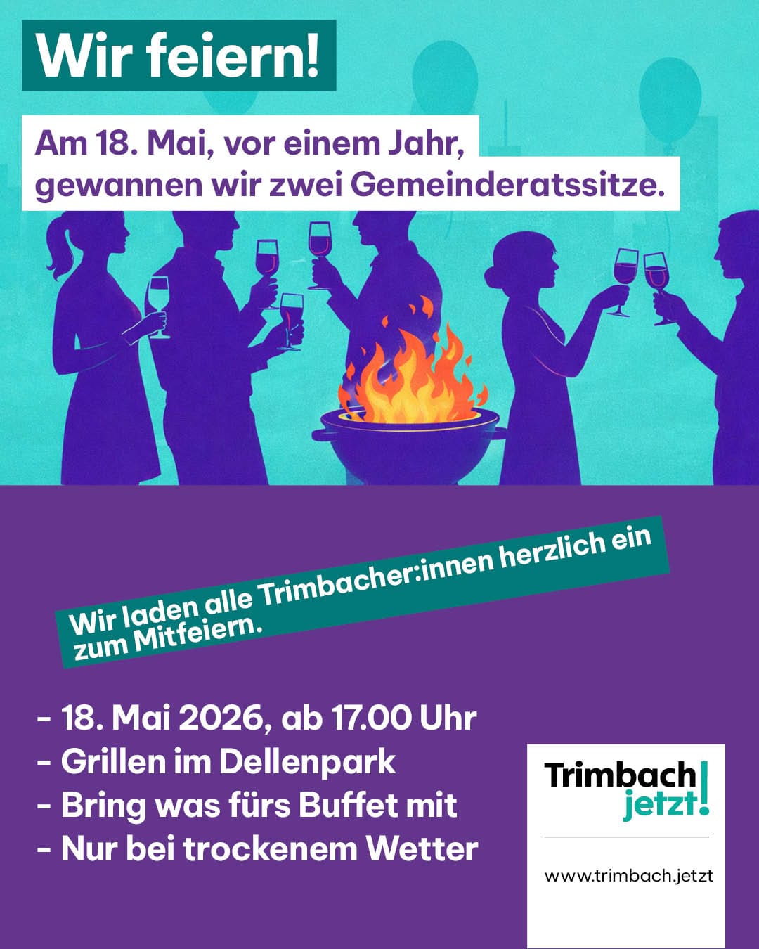 Es ist Zeit für ein Fest! Da, wo wir am 18. Mai 2025 unseren Einzug in den Gemeinderat bejubelten, wollen wir erneut miteinander feiern. Auf den Tag genau ein Jahr nach dem Wahlerfolg von Trimbach jetzt! kommen wir wieder im Dellenpark zusammen. Am Feuer stossen wir an. Darauf, dass wir in der Exekutive, aber auch in Kommissionen und Arbeitsgruppen die Entwicklung unserer Gemeinde mitprägen dürfen.